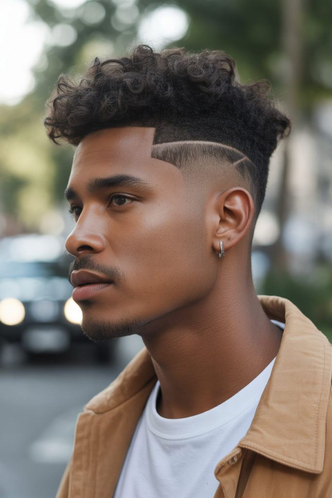 Perfect for men who love natural curls, this style combines a temple fade with defined curls on top. It’s stylish, modern, and works for both casual and professional settings.